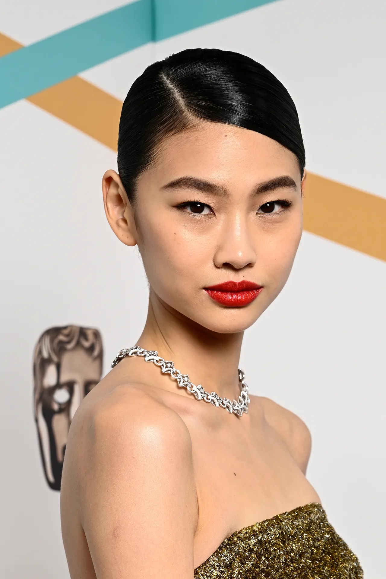 Tampaknya modern glamour selalu jadi “seragam” red carpet Hoyeon. Tak terkecuali di BAFTA Awards 2023 dimana ia tampil dengan red lip dan sleek hair. Makeup red carpet yang elite.