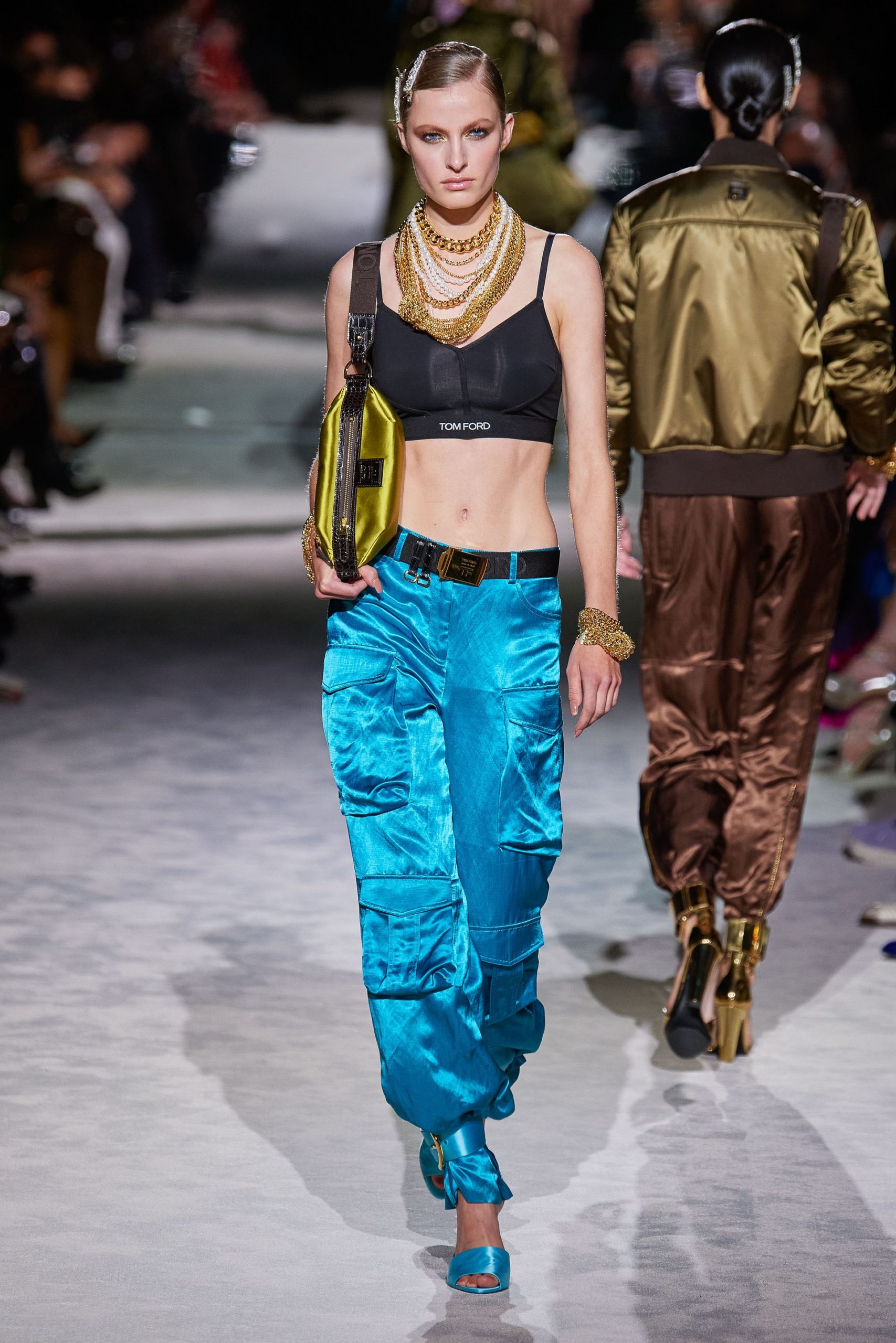 Masih ingat dulu masa remaja pakai celana cargo? Celana longgar dengan banyak kantong yang bahkan bisa untuk simpan barang esensial kita si minimalis. Untuk gaya 2022, Tom Ford tak ragu menghidupkan lagi celana yang dulu jadi gaya andalan Britney Spears, Christina Aguilera, dan Fergie ini. Lagi-lagi menduplikat versi aslinya, Tom Ford memadukan cargo dengan bra top untuk tampilan Y2K solid, terbuka di bagian perut.
